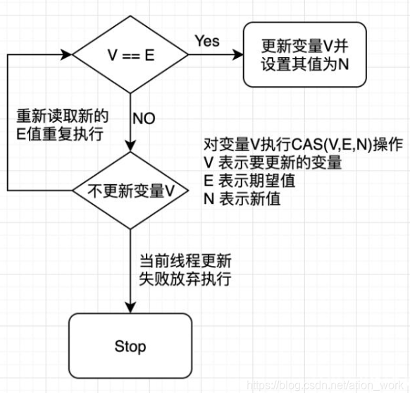 如果V值等于E值,则将V的值设为N。若V值和E值不同,则说明已经有其他线程做了更新,则当前线程什么都不做。通俗的理解就是CAS操作需要我们提供一个期望值,当期望值与当前线程的变量值相同时,说明还没线程修改该值,当前线程可以进行修改,也就是执行CAS操作,但如果期望值与当前线程不符,则说明该值已被其他线程修改,此时不执行更新操作,但可以选择重新读取该变量再尝试再次修改该变量,也可以放弃操作。