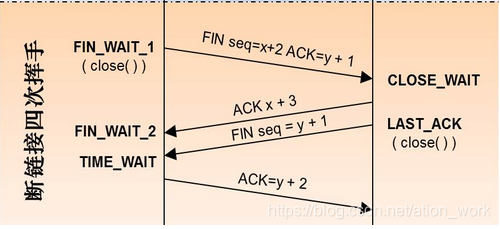 第一次挥手:主机1(可以使客户端,也可以是服务器端),设置Sequence Number和Acknowledgment Number,向主机2发送一个FIN报文段;此时,主机1进入FIN_WAIT_1状态;这表示主机1没有数据要发送给主机2了;