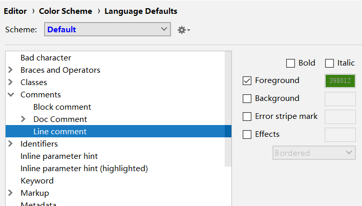 File-->Settings-->Editor--> Color Scheme-->Language Defaults-->Comments-->Line conmment