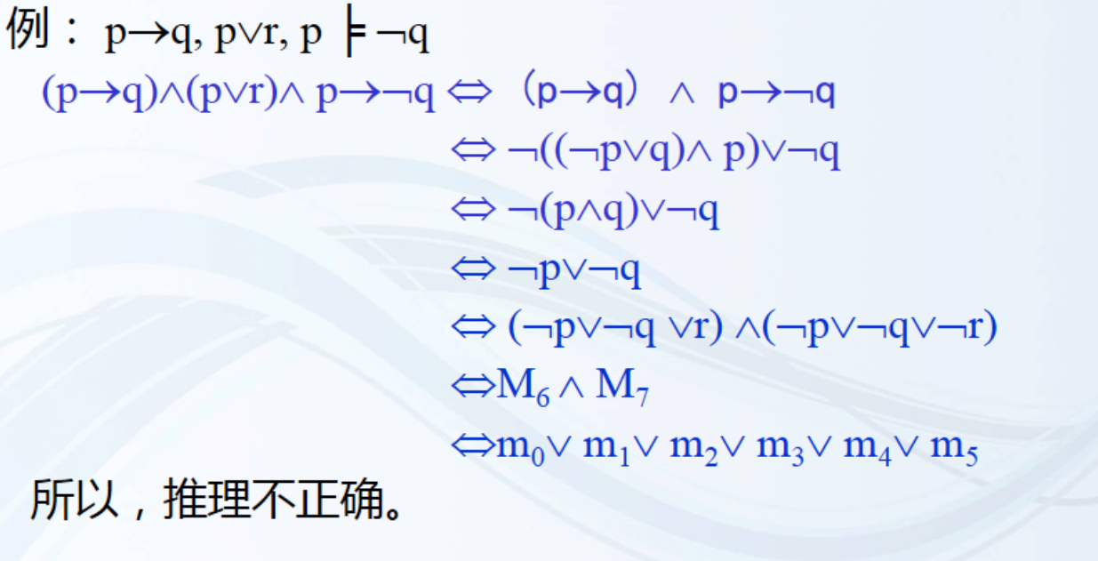 若公式(A1 ∧ A2 ... ∧ Ak) -> B 的主析取范式含全部2^n个极小项,则说明推理正确。否则推理不正确。