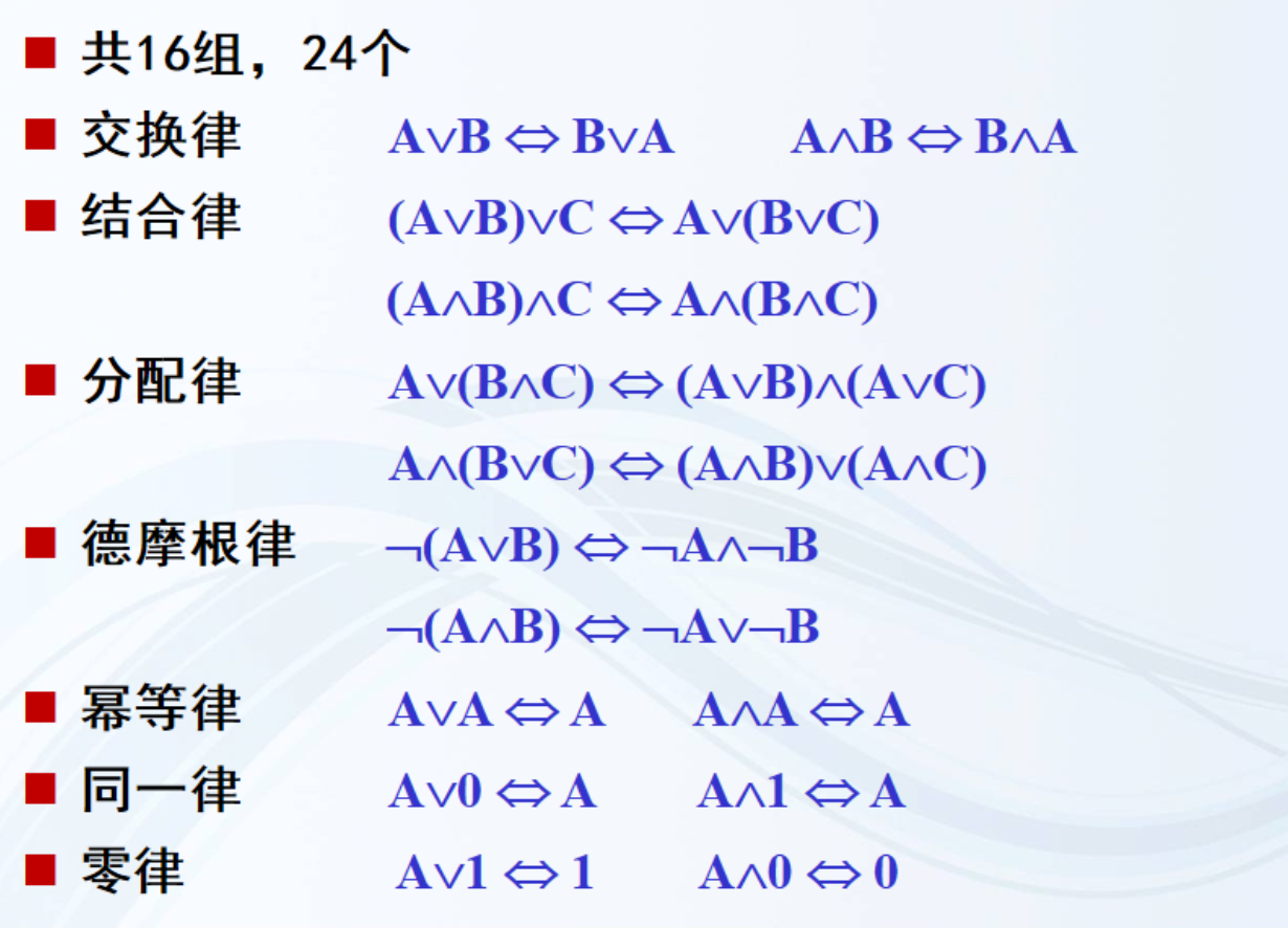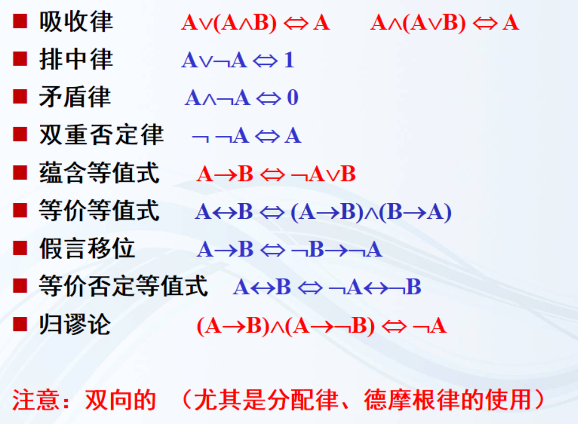- 永真命题公式(永真公式或重言式):命题公式A在所有解释下的真值都为真,用1表示。