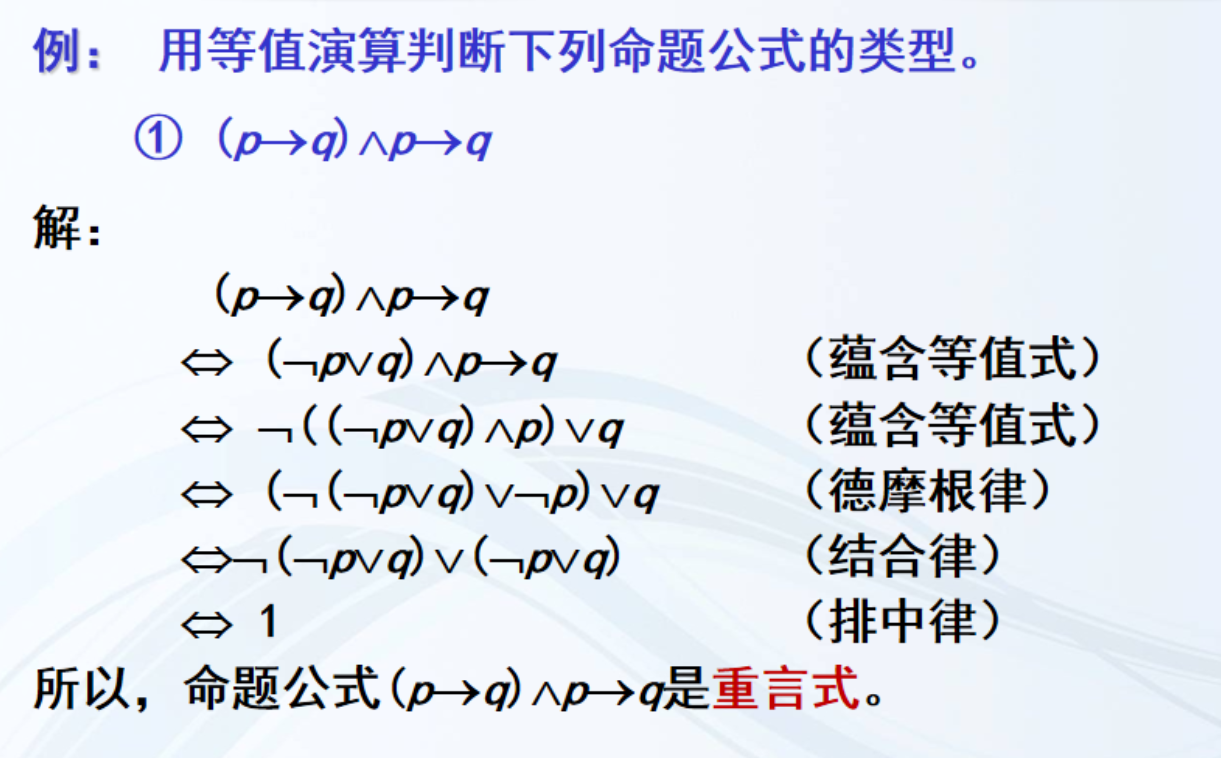 也就是判断命题公式是否与0或1等值,与0等值的是矛盾式,与1等值的是重言式。