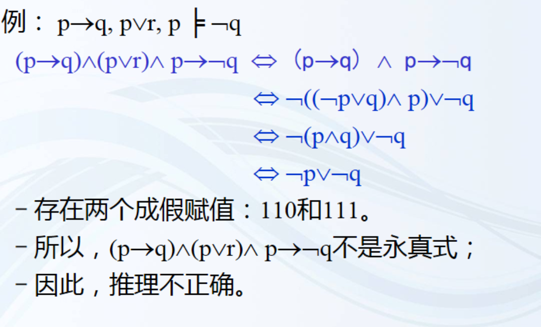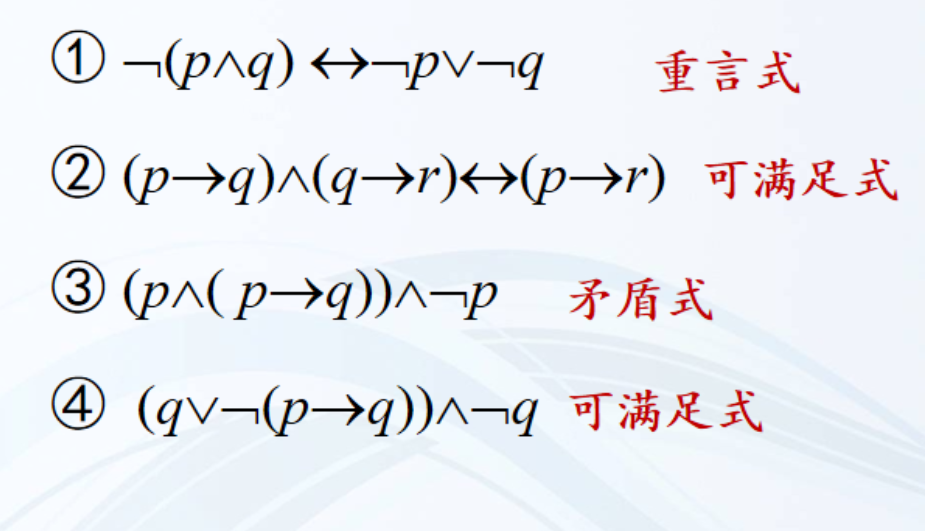 - 可满足命题公式(可满足公式):至少存在一个解释使命题公式A的真值为真。