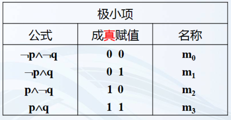 极小项:简单合取式,每个命题变元(q)与其否定(¬q),二者之一仅出现一次(即不是q就是¬q,二者只能有一个)。(比如:p∧q、p∧¬q)