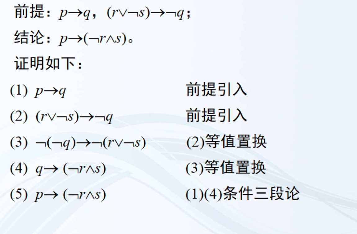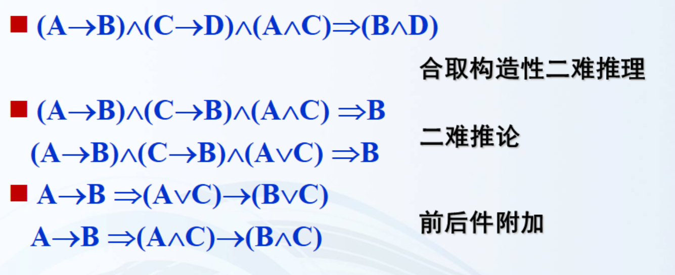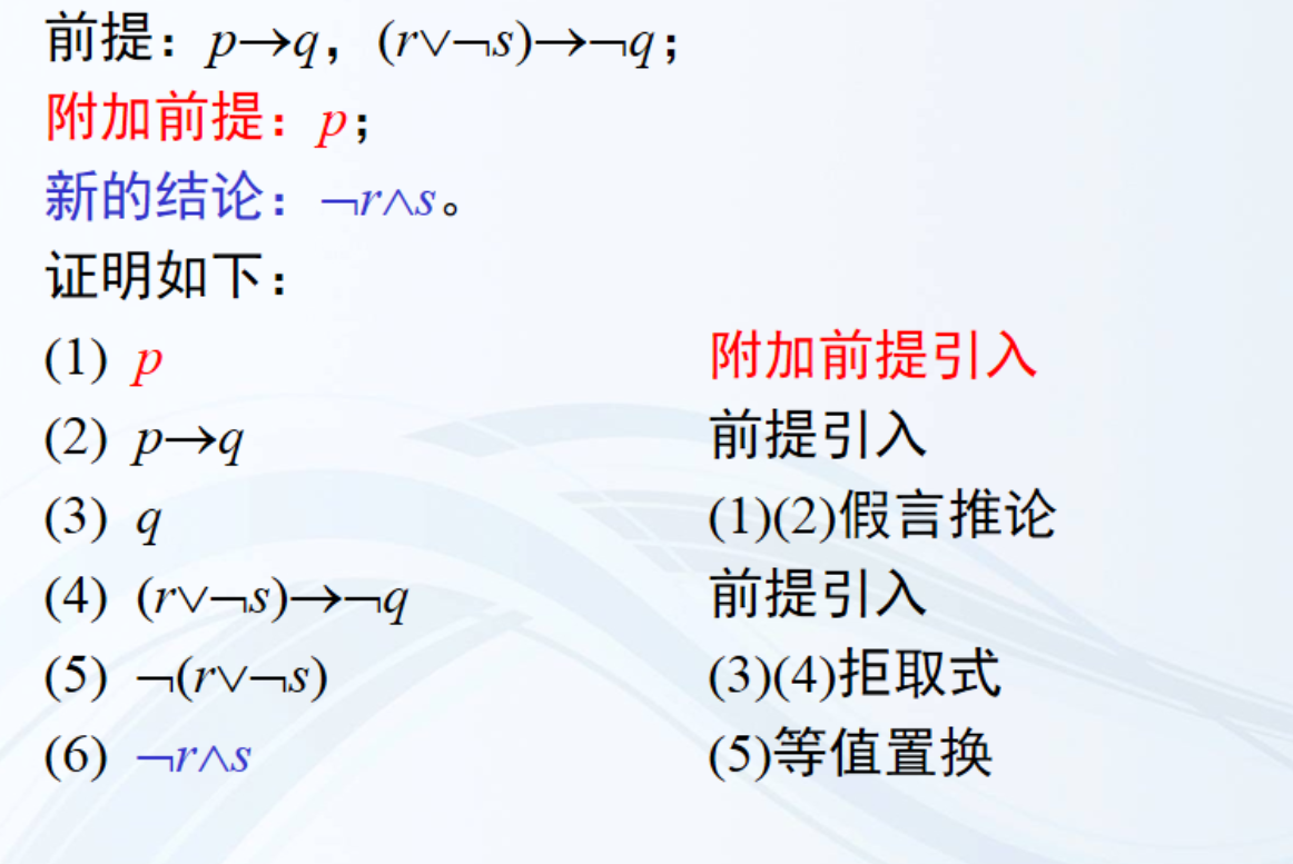 间接构造证明推理:从一组已知的命题公式的前提以及附加的前提出发,利用推理规则间接地给出推理有效性证明的推理。