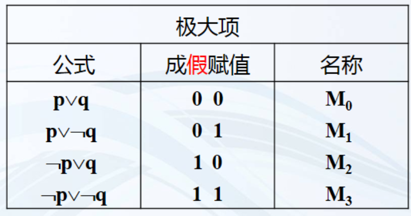 极大项:简单析取式,每个命题变元(q)与其否定(¬q),二者之一仅出现一次(即不是q就是¬q,二者只能有一个)。(比如:p∨q、p∨¬q)