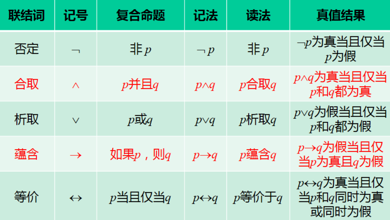 合取联结词 "∧":设p、q为两任意命题,复合命题 "p并且q"(或 "p和q")称为p和q的合取式,记为p∧q。并规定,p∧q为真当且仅当p和q都为真。(自然语言中 "并且"、"和"、"与" 和 "既...又..."等关联词的逻辑抽象)