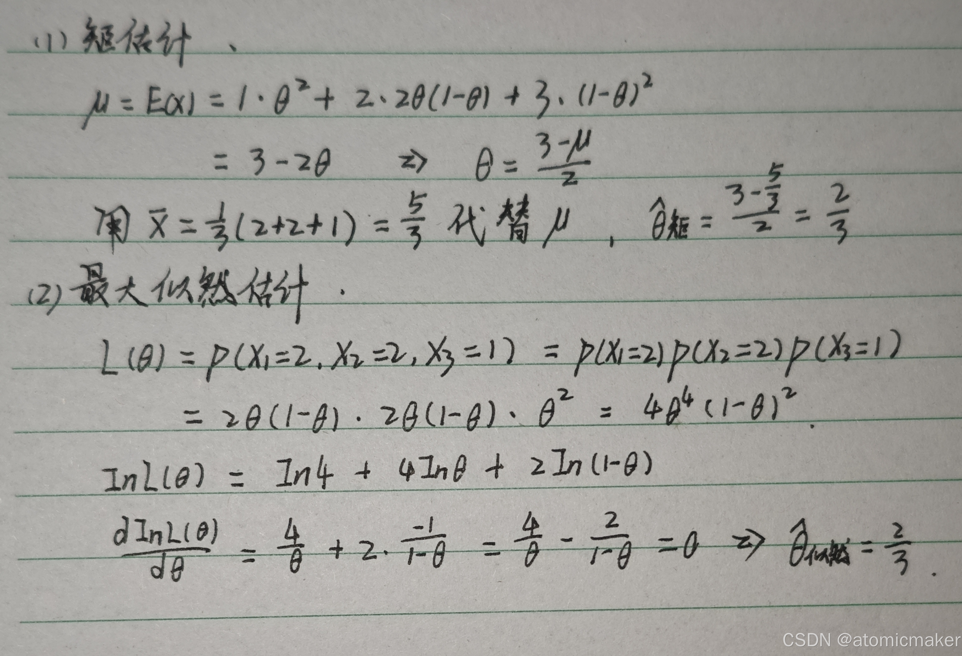 - 求对数似然函数的最大值点(对 θ 求导并令导数为 0):
