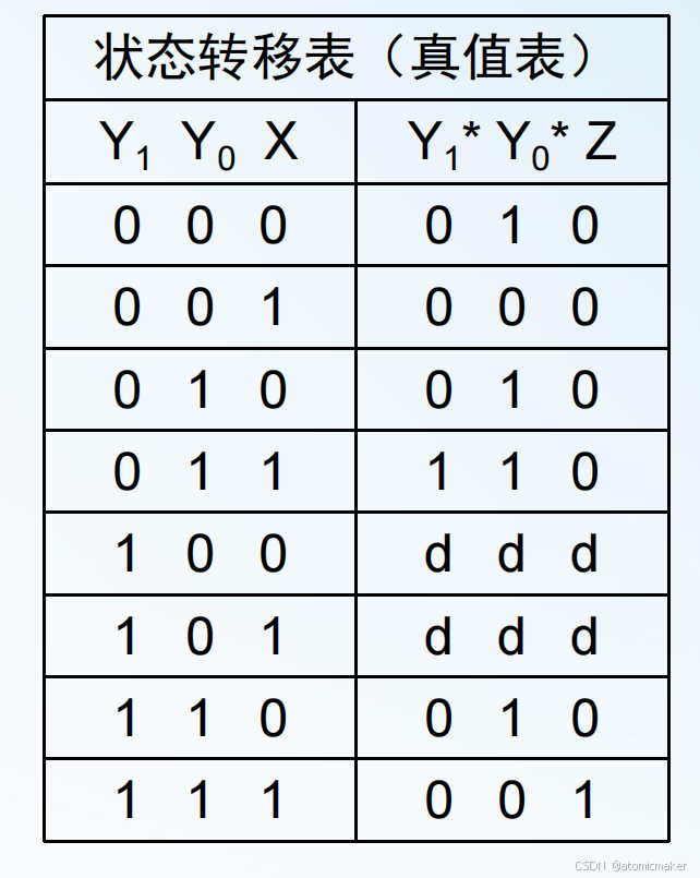 由状态表得到状态转换表,再得到真值表,从而得到次态函数。