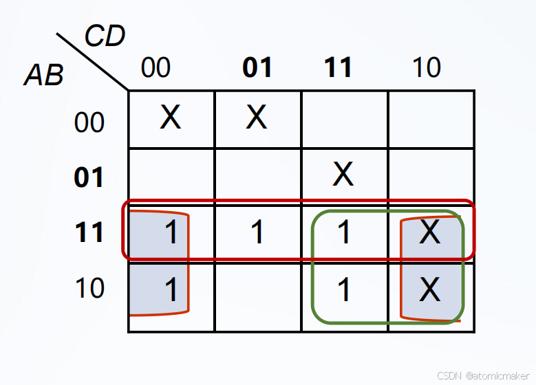 - 每个单元对(最大矩形框,框内方格数为2^n)都可以消除一个不相同的变量而留下相同的变量。