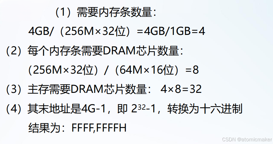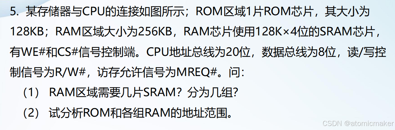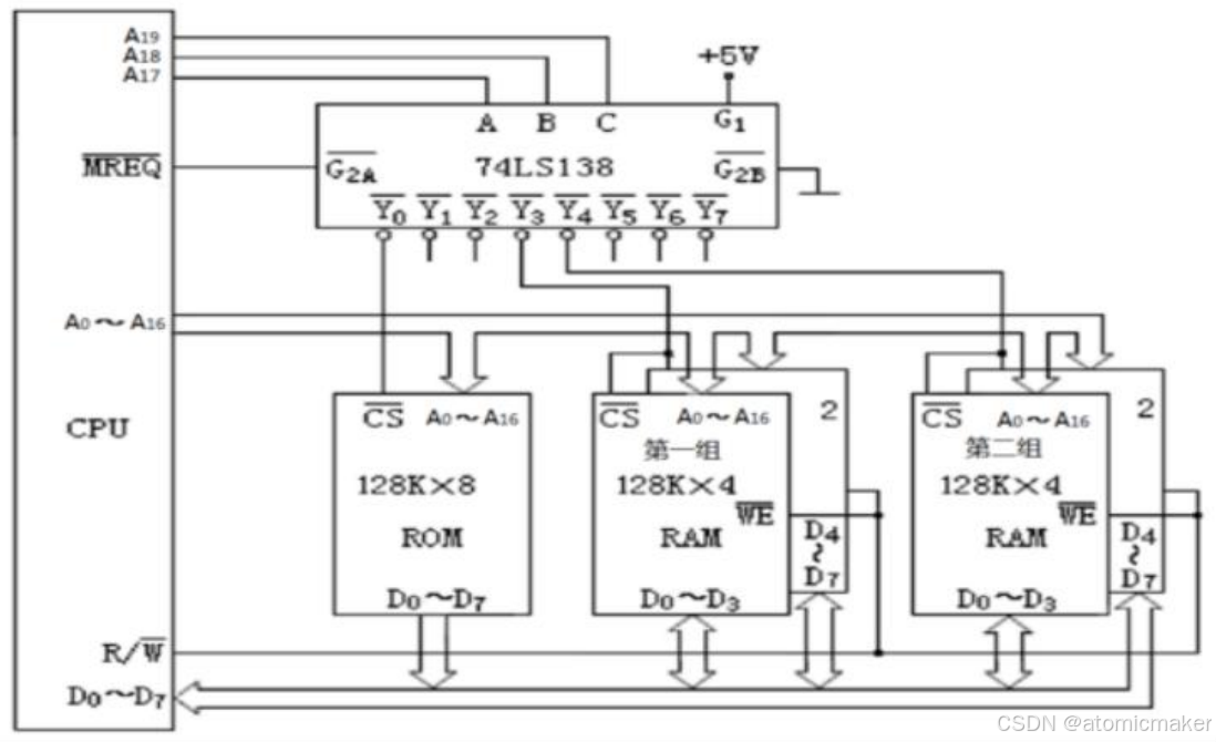 - 新增地址线通过译码器产生片选信号,选中不同芯片(如 32K 需 15 根地址线,8K 需 13 根,新增 A13、A14 经 2-4 译码器产生 4 个片选信号,对应 4 片 8K 芯片)。