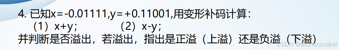 | 单符号位法 | 最高位进位C_7 ≠ 次高位进位C6 → OF=1 | [64]补=01000000,[65]补=01000001 相加:01000000+01000001=10000001 C7=0,C6=1 → OF=1(溢出) |