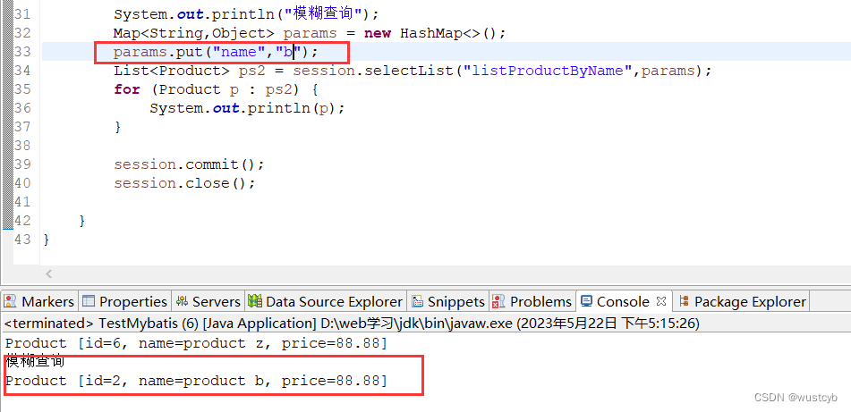 在动态查询的练习中,突然发现是因为在测试类中对name赋值了的,这个赋值是给条件赋值,如上图,只查得到名字有b的了