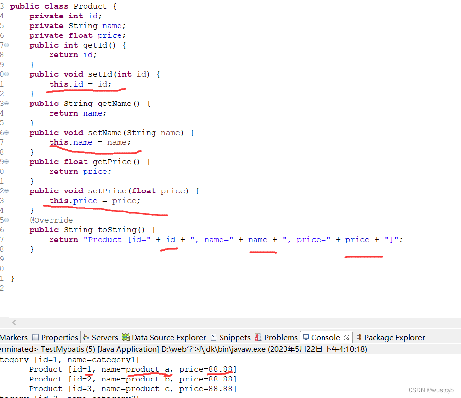 测试类中实际输出的是对应java包中的内容,get啊set啊一大堆通通用getProducts方法封装到我设置的列表里作为一层,并通过两次system.out输出结果