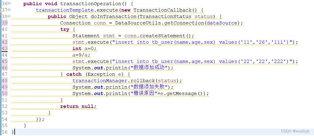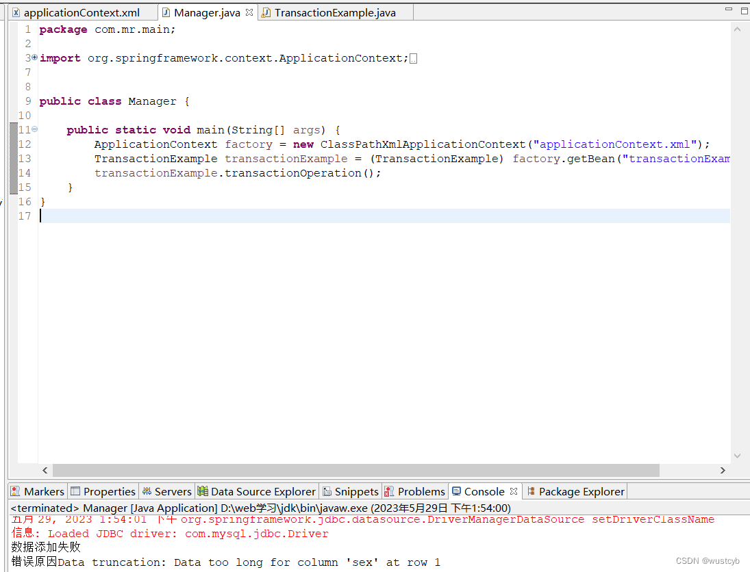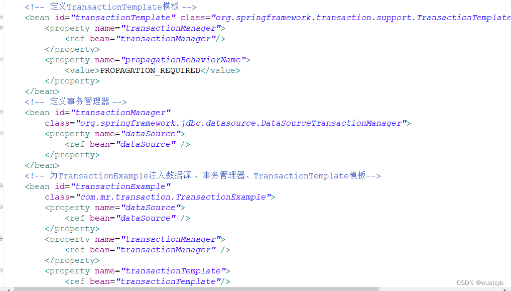 在xml文件中,配置数据源、定义模板、定义事务管理器,完成这三项后一并注入TransactionExample中