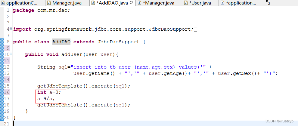 这里首先补充一下,设计a=0是为了先行制造异常事务判断是否运行成功