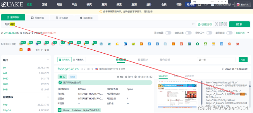在输入框中检索:奇虎科技,会发现返回的结果虽然很多,但是没有一个是包含完整且连贯的奇虎科技字符串的,其实原因就是我们输入的奇虎科技被拆分成了:奇虎和科技进行搜索,以此实现模糊查询的效果。