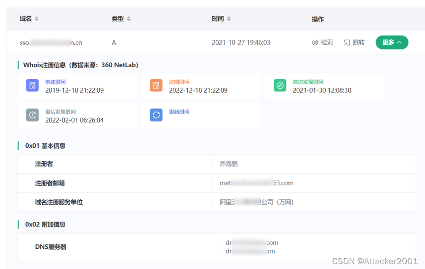 对搜索命中的数据可在页面进行对应的展示,包括搜索结果展示和聚合信息展示。聚合信息展示进一步分为注册商聚合信息展示、电话聚合信息展示、电邮聚合信息展示、时间聚合信息展示等。支持不少于10个字段,包括IP、域名、子域名、组织结构、组织邮箱、创建时间、过期时间、DNS、状态
