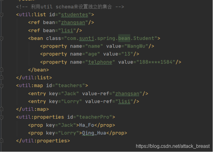 使用基本的集合标签来定义集合时,不能将集合作为独立的Bean定义,进而导致其他Bean无法引用该集合,所以无法在不同Bean之间共享集合,为了解决这个问题,可以使用util schema里的集合标签定义独立的集合Bean,需要注意的是,必须在<beans>根元素里添加util schema定义。