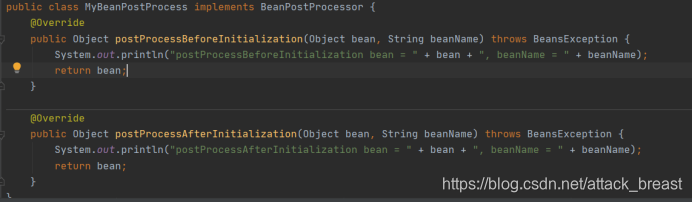 对Bean后置处理器而言,需要实现BeanPostProcessor接口,在初始化方法init-method被调用前后,Spring将把每个Bean实例分别传递给上述接口的以下2个方法: