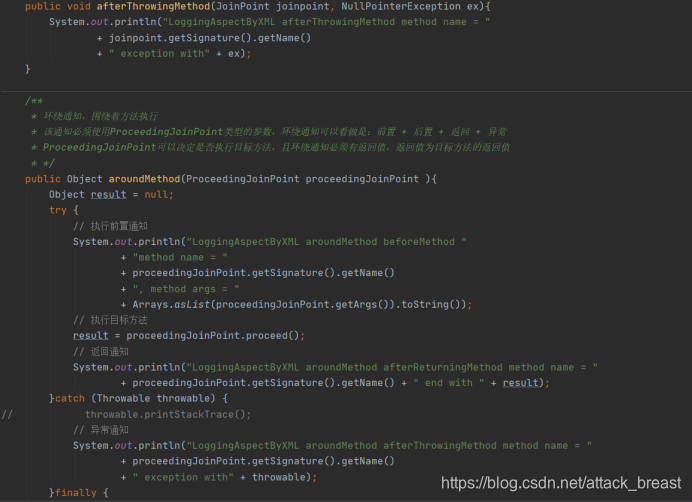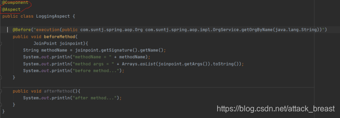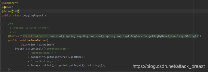 | @Component @Aspect public class LoggingAspect { /** * 前置通知,在方法执行之前执行 * */ @Before("execution(public com.suntj.spring.aop.Org com.suntj.spring.aop.impl.OrgService.getOrgByName(java.lang.String))") public void beforeMethod( JoinPoint joinpoint){ System.out.println("beforeMethod " + "method name = " + joinpoint.getSignature().getName() + ", method args = " + Arrays.asList(joinpoint.getArgs()).toString()); } /** * 后置通知,方法执行之后执行,无论方法是否发生异常 * */ @After("execution(public com.suntj.spring.aop.Org com.suntj.spring.aop.impl.OrgService.getOrgByName(java.lang.String))") public void afterMethod(JoinPoint joinpoint){ System.out.println("afterMethod method name = " + joinpoint.getSignature().getName() + " end"); } /** * 返回通知,在方法正常执行结束、返回结果之后执行,该通知可以访问方法所返回的结果 * */ @AfterReturning( value="execution(public com.suntj.spring.aop.Org com.suntj.spring.aop.impl.OrgService.getOrgByName(java.lang.String))", returning = "result") public void afterReturningMethod(JoinPoint joinpoint,Object result){ System.out.println("afterReturningMethod method name = " + joinpoint.getSignature().getName() + " end with " + result); } /** * 异常通知,在方法抛出异常之后执行,该通知可以访问方法发生的异常,且可以指定在出现特定异常时再去执行通知 * */ @AfterThrowing( value="execution(public com.suntj.spring.aop.Org com.suntj.spring.aop.impl.OrgService.getOrgByName(java.lang.String))", throwing = "ex") public void afterThrowingMethod(JoinPoint joinpoint, NullPointerException ex){ System.out.println("afterThrowingMethod method name = " + joinpoint.getSignature().getName() + " exception with" + ex); }