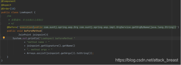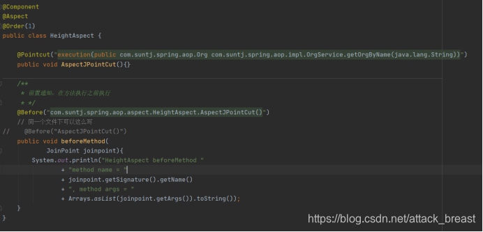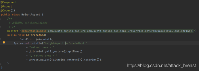 /** * 前置通知,在方法执行之前执行 * */ @Before("com.suntj.spring.aop.aspect.HeightAspect.AspectJPointCut()") // 同一个文件下可以这么写 // @Before("AspectJPointCut()") public void beforeMethod( JoinPoint joinpoint){ System.out.println("HeightAspect beforeMethod " + "method name = " + joinpoint.getSignature().getName() + ", method args = " + Arrays.asList(joinpoint.getArgs()).toString()); } } |
