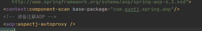 <!-- 配置切面bean --> <bean id="loggingAspectByXML" class="com.suntj.spring.aop.aspect.LoggingAspectByXML"></bean>