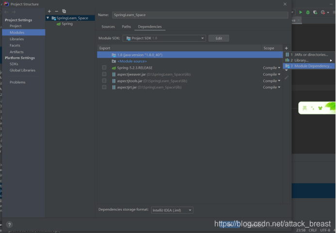 /aspectj.weaver.jar/spring-aspects.jar,例如从AspectJ官网https://www.eclipse.org/aspectj/downloads.php下载对应的jar包,解压jar后在lib目录下找到上述的3个文件, 然后在idea中配置:File-Project Structure-Modules-dependencies-jars or directories