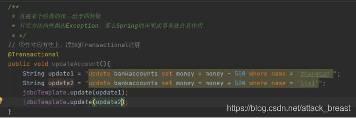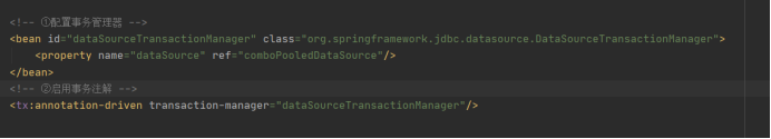 <!-- 1.声明bean --> <bean id="transaction2" class="com.suntj.spring.transaction.Transaction2"> <property name="jdbcTemplate" ref="jdbcTemplate"/> </bean> <!-- 2.配置事务管理器 --> <bean id="dataSourceTransactionManager" class="org.springframework.jdbc.datasource.DataSourceTransactionManager"> <property name="dataSource" ref="comboPooledDataSource"/> </bean> <!-- 3.配置事务各种属性 --> <tx:advice id="txAdvice" transaction-manager="dataSourceTransactionManager"> <tx:attributes> <!-- 根据方法名,来指定具体方法的具体事务属性 --> <tx:method name="updateAccount" propagation="REQUIRED" isolation="READ_COMMITTED" read-only="false" timeout="3"/> <tx:method name="get*" read-only="true"/> </tx:attributes> </tx:advice> <!-- 4.配置事务切点,并关联事务的各种属性 --> <aop:config> <!-- 配置切点表达式 --> <aop:pointcut id="txPointcut" expression="execution(public void com.suntj.spring.transaction.Transaction2.updateAccount())"/> <!-- 配置切面及通知 --> <aop:advisor advice-ref="txAdvice" pointcut-ref="txPointcut"/> </aop:config> |