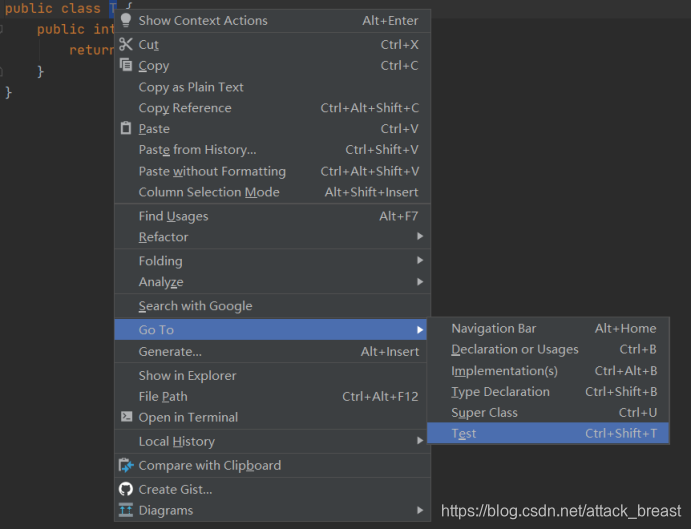 选中类名,然后鼠标右击,选择Go To -> Test(或者使用快捷键ctrl+ shift + t)