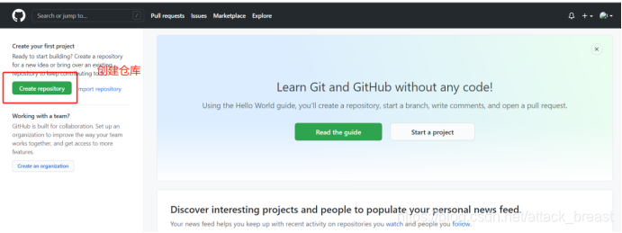 账号创建成功或者点击导航栏上的github图标进去Github主页,显示用户动态信息 + git库;
