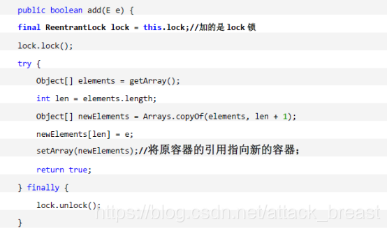 以下代码是向CopyOnWriteArrayList 中add 方法的实现,可以发现在添加的时候是需要加锁的,否则多线程写的时候会Copy 出N 个副本出来。