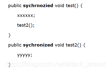 在上面代码段中,执行test 方法需要获得当前对象作为监视器的对象锁,但方法中又调用了test2 的同步方法。如果锁是具有可重入性的话,那么该线程在调用test2 时并不需要再次获得当前对象的锁,可以直接进入test2 方法进行操作。可重入锁最大的作用是避免死锁。如果锁是不具有可重入性的话,那么该线程在调用test2 前会等待当前对象锁的释放,实际上该对象锁已被当前线程所持有,不可能再次获得,那么线程在调用同步方法、含有锁的方法时就会产生死锁。
