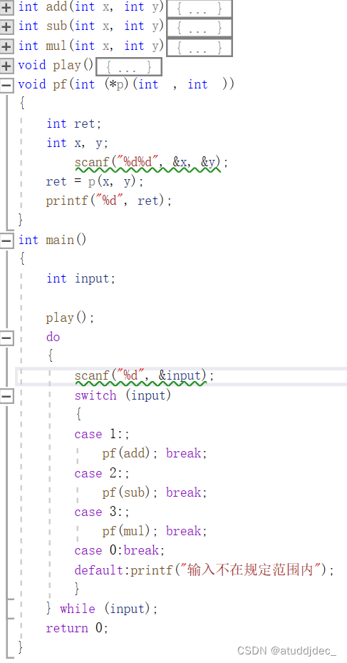 例如int(*pf[4])(int ,int )={add,sub ,mul,div}即pf数组指针中包含四个函数指针。