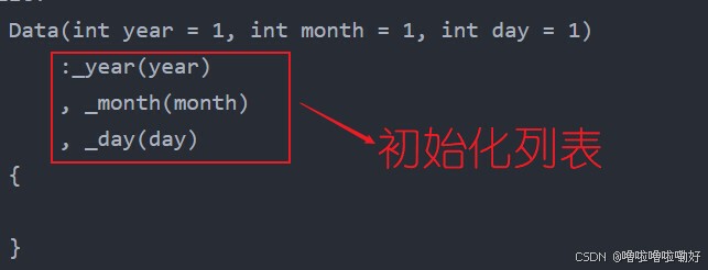 之前学习构造函数的时候,初始化成员都是在函数体里赋值的,但他还有另一种方式——利用初始化列表。初始化列表的使用形式是以一个冒号开始,接着是以一个逗号分隔的数据成员列表,每个“成员变量”后面都跟一个放在括号里面的初始值或表达式。