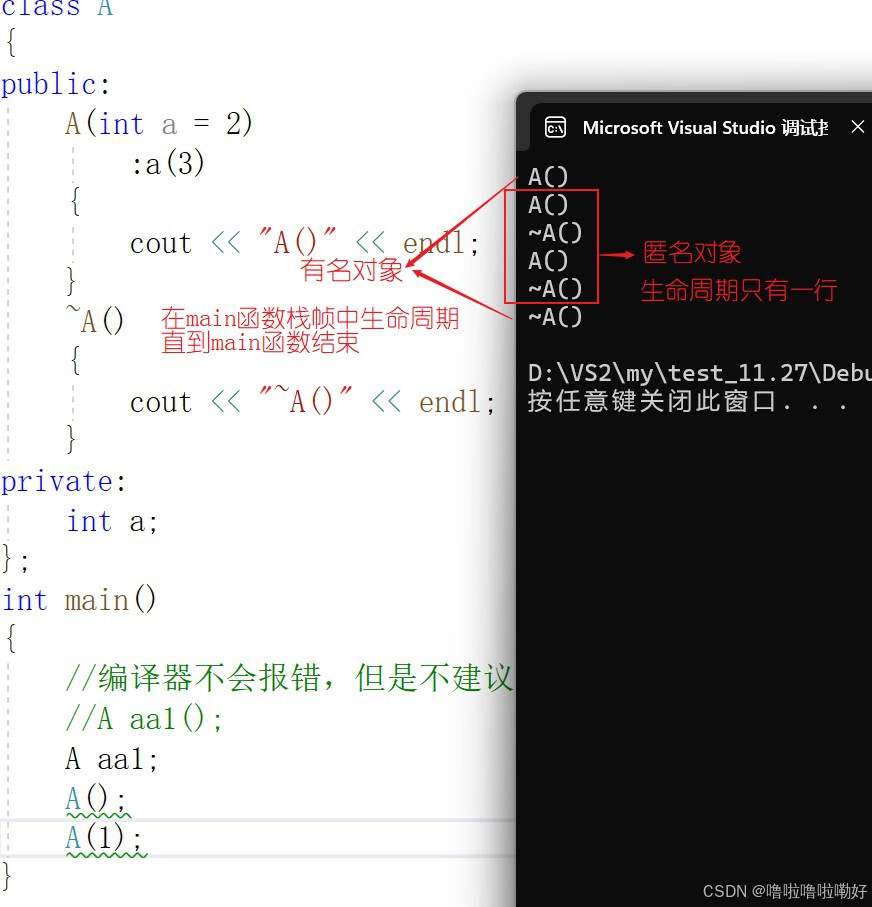4.初始化列表中按照成员变量在类中的声明顺序进行初始化,和成员在初始化列表中出现的先后顺序无关。建议声明顺序和初始化列表顺序保持一致。