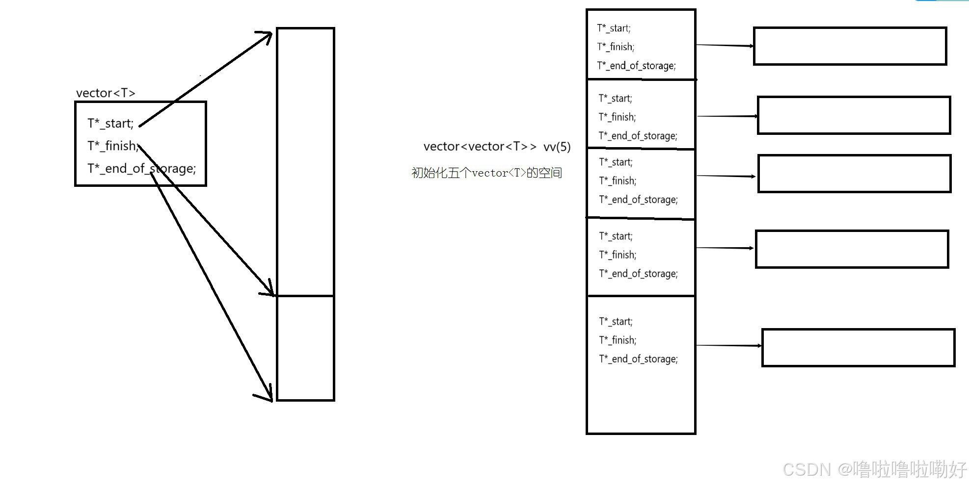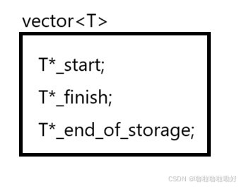 了解vector类的成员变量:T*_start(指向开头的指针),T*_finish(指向元素结尾的下一个的指针),T*_end_of_storage(指向容量大小的下一个的指针)。