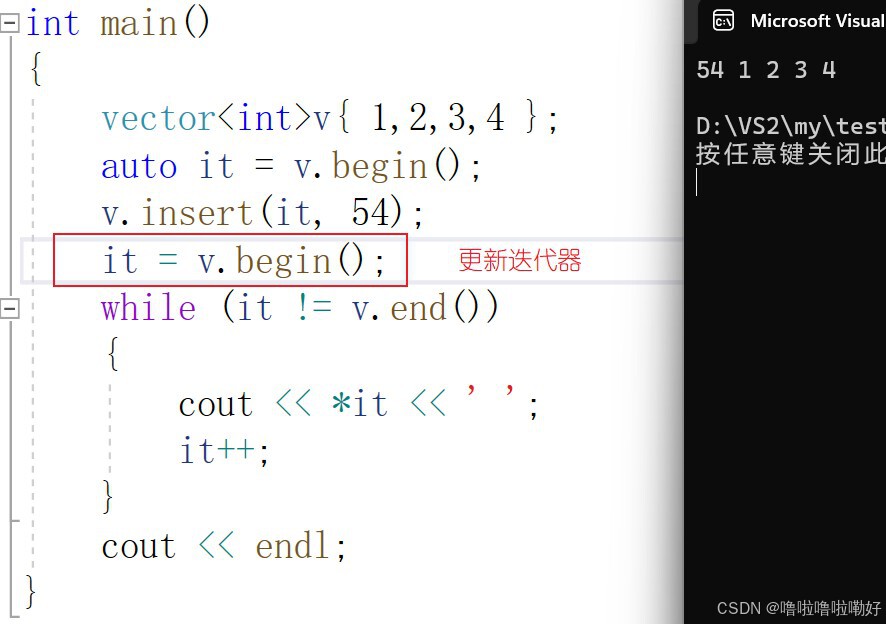 答案是运行不成功的,因为erase删除了迭代器it,导致迭代器失效,已经失效的迭代器不能进行++,所以会导致程序崩溃。所以我们要怎么做呢?有同学说上面的代码也有问题,如果erase会把后面的数据往前面挪,那么再++会检查不到被删数据后面的一个数据。这是一个问题,但是改正后它还是出错,而且我们还没有更新迭代器。