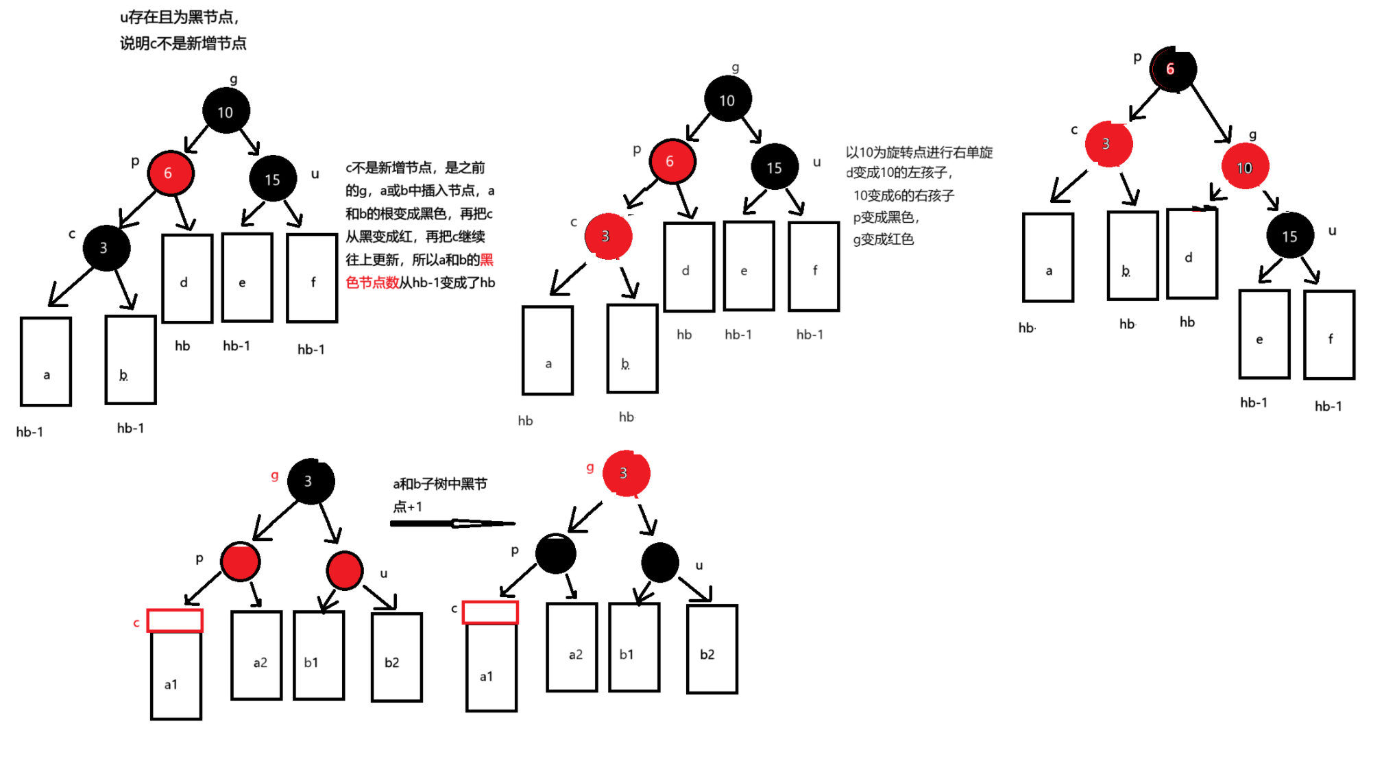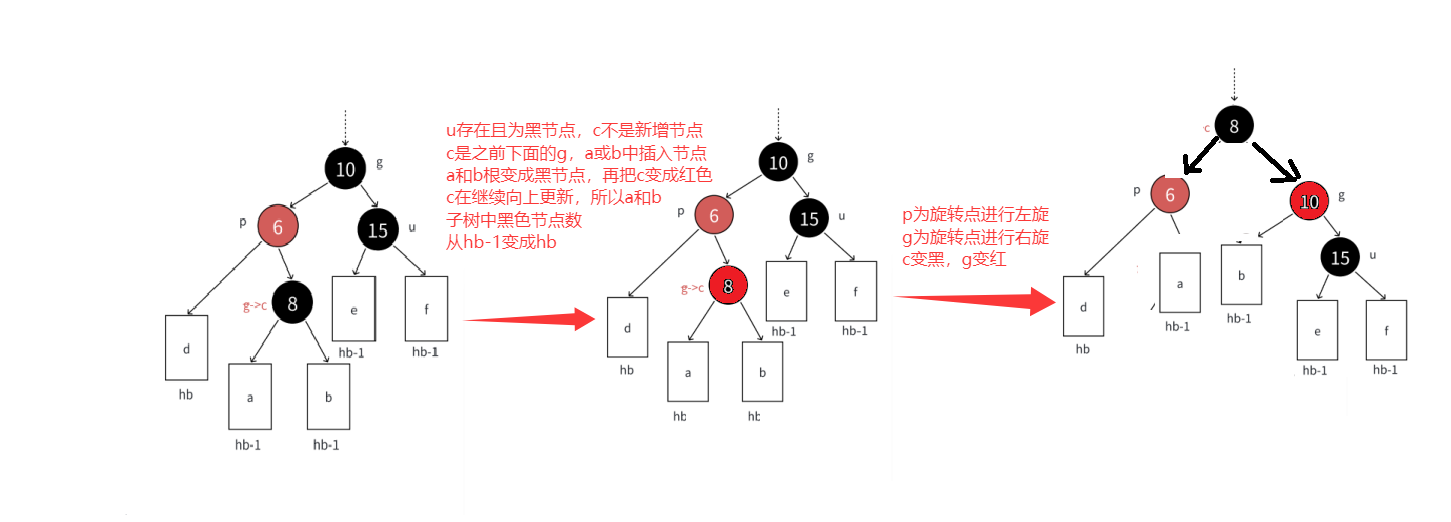 c为红,p为红,g为⿊,u存在且为红,则将p和u变⿊,g变红。在把g当做新的c,继续往上更新。