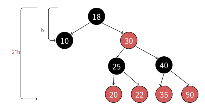 最长路径为一黑一红间隔组成,那么最⻓路径的⻓度为2*bh。 (每条路径上的黑色节点数要相同)