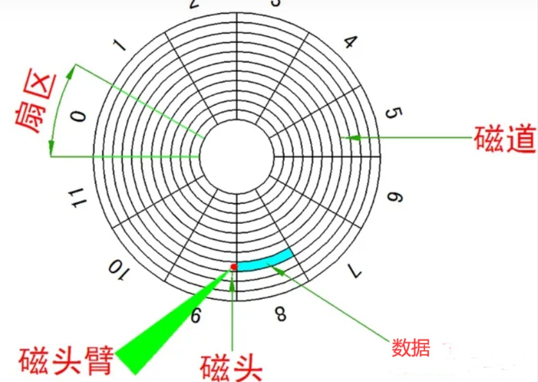 • 扇区:从磁盘读出和写入信息的最小单位,通常大小为 512 字节。