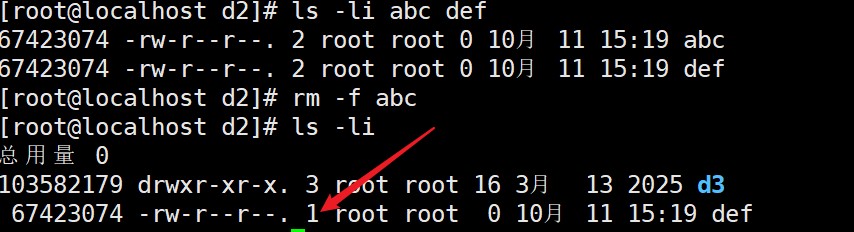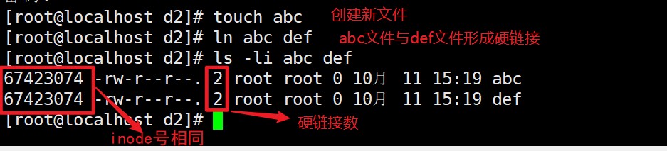 def文件是指向abc文件的硬链接,因为def文件没有独立的inode号,所以表明def文件(硬链接)不是一个独立的文件。硬链接的本质是在指定目录下,建立新的文件名和目标inode的映射关系,但并没有在系统层面创建新文件。也可以认为def文件名是abc文件名的别名。