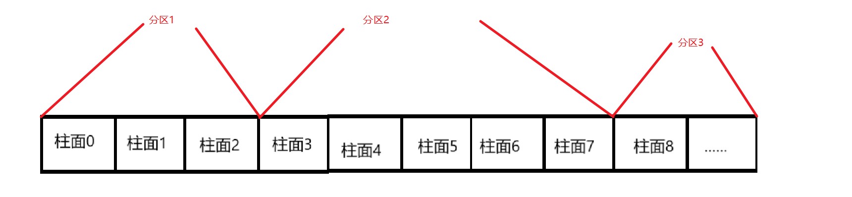 • 柱面是分区的最小单位,我们可以利用参考柱面号码的方式来进行分区,其本质就是设置每个区的起始柱面和结束柱面号码。此时我们可以将硬盘上的柱面(分区)进行平铺,将其想象成一个大的平面,如下图所示: