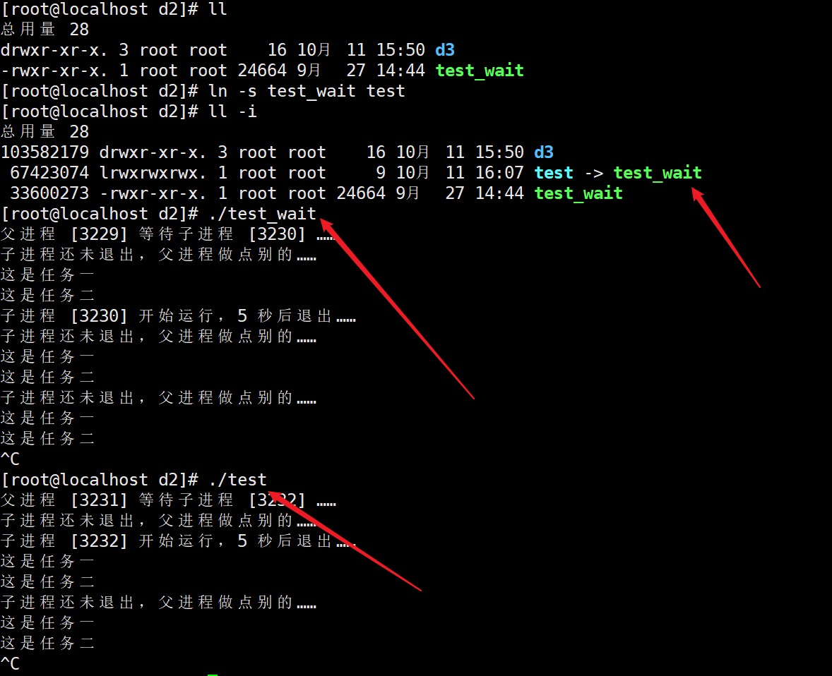 67423074 lrwxrwxrwx. 1 root root 9 10月 11 16:07 test -> test_wait