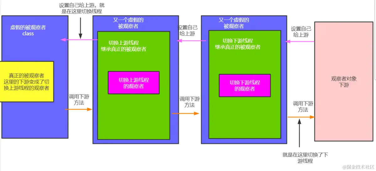 当然是切换线程的任务了,我们要在指定线程切换任务,所以我们需要定义一个方法来切换线程。既然切换线程,也就是说指定线程里运行上游的setObserver传入一个下游,你看看,参数不就出来了,要能切换,首先得有一个上游,其次得有一个下游,然后得指定线程。