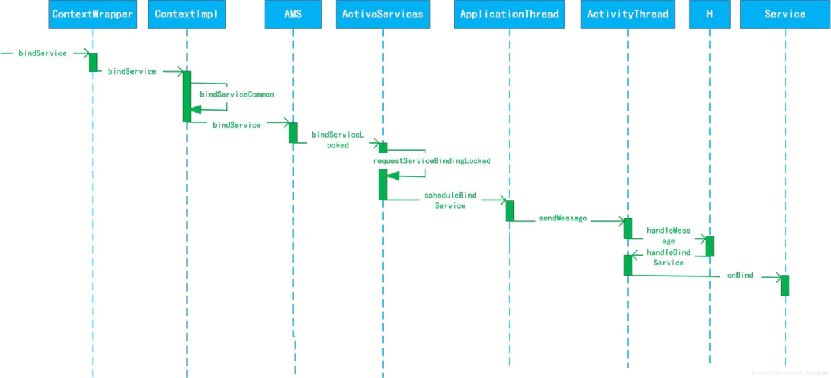 注释2处如果BindServiceData的成员变量rebind的值为false,这样会调用注释3处的代码来调用Service的onBind方法,这样Service处于绑定状态了。如果rebind的值为true就会调用注释5处的Service的onRebind方法,结合前文的bindServiceLocked方法的注释4,我们得知如果当前应用程序进程的Client端第一次与Service进行绑定,并且Service已经调用过onUnBind方法,则会调用Service的onRebind方法。