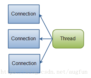 如果需要管理同时打开的成千上万个连接,这些连接每次只是发送少量的数据,例如聊天服务器,实现NIO的服务器可能是一个优势。同样,如果你需要维持许多打开的连接到其他计算机上,如P2P网络中,使用一个单独的线程来管理你所有出站连接,可能是一个优势。一个线程多个连接的设计方案如下图所示: