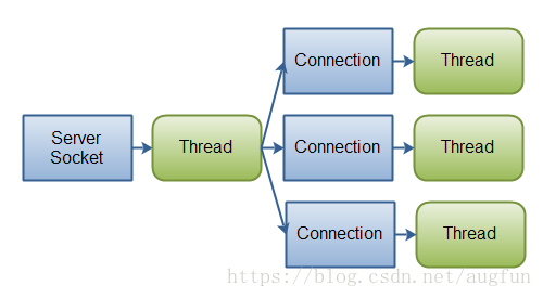 如果你有少量的连接使用非常高的带宽,一次发送大量的数据,也许典型的IO服务器实现可能非常契合。下图说明了一个典型的IO服务器设计: