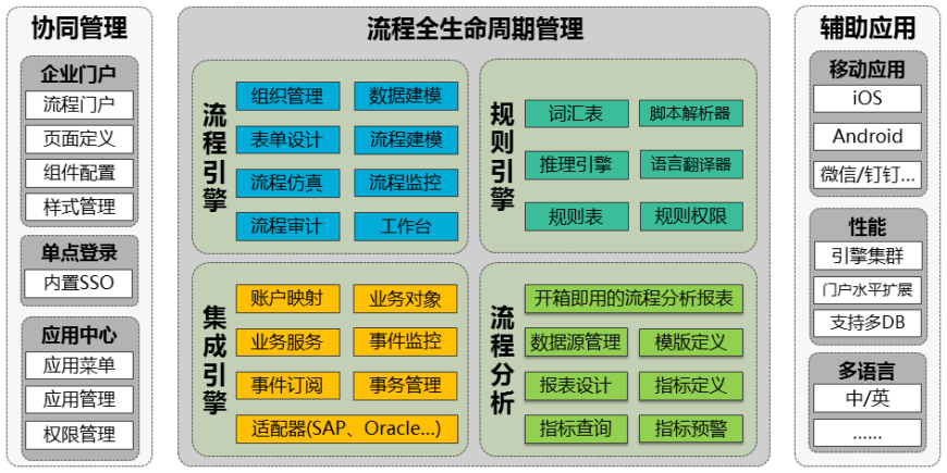 H3 BPM是一款强大的流程管理工具,包括流程引擎、集成引擎、规则引擎和流程分析等功能。流程引擎遵循WFMC标准,支持图形化设计和多终端接入。集成引擎基于SOA架构,提供高可用性和快速集成。规则引擎帮助企业高效管理业务规则,流程分析系统则进行多维度流程监控和绩效评估。此外,H3 BPM还提供应用中心、报表中心、企业门户和移动应用,支持多语言和高性能组件,旨在实现企业流程的优化和自动化。