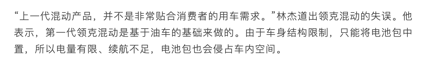 在新能源这块,领克似乎也还差口气,虽然它也推出过不少混动产品。但第一代领克混动车属于典型的”油改电“,最明显的问题就是续航不足。连领克自己也承认——“上一代混动产品,并不是非常贴合消费者用车需求”。